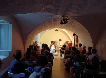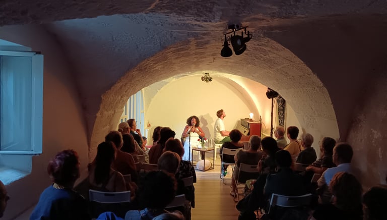 Nous voyageons ainsi au fil de concerts intimistes, nous sublimons ces moments par des échanges du public et des artistes autour d'apéritifs dînatoires maison , et favorisons les petites formules duo ou trio en acoustique..