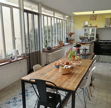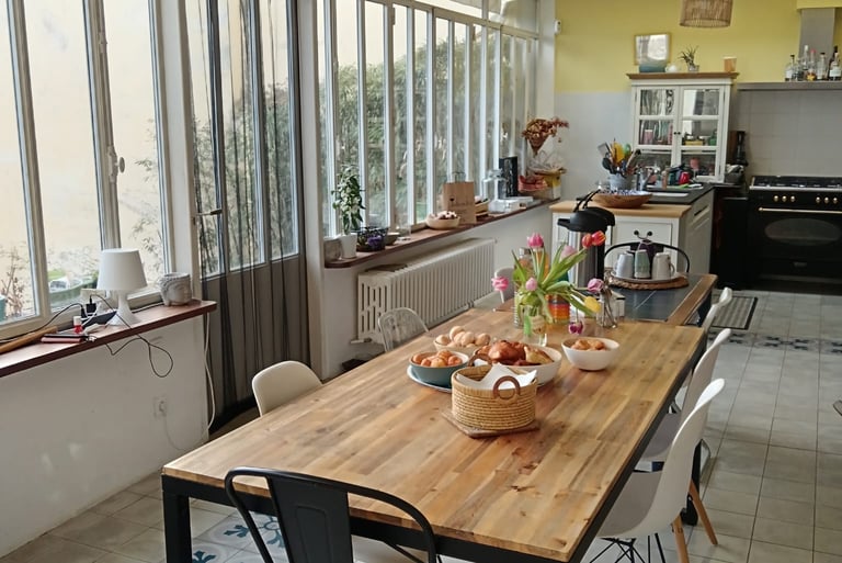 Cette maison nous a tout de suite inspirées par sa constitution qui permettait de grands appartements de vies respectives et des espaces partagés, et alors chacune au carrefour d'une nouvelle vie, nous avons réuni ainsi nos envies de partage et d'authentiques relations humaines au service de notre projet...